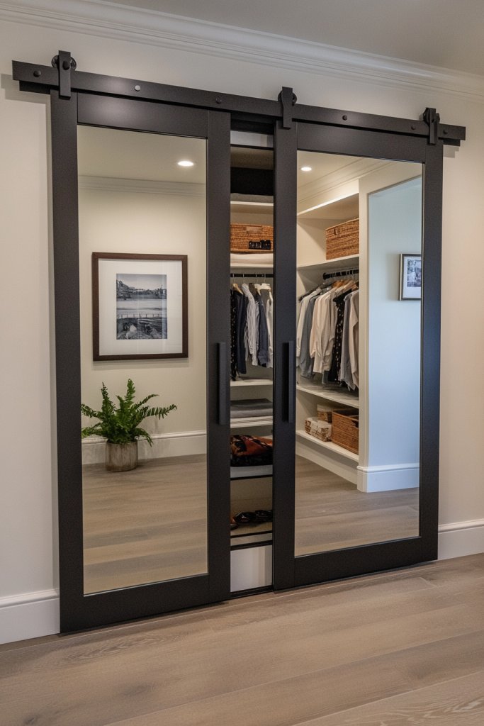 Imagine sleek, full-length mirrors framed in slim metal or wood, sliding effortlessly along a barn door track. When closed, they reflect your room, creating an illusion of infinite space. Open, they reveal your closet while adding a layer of elegance. The mirror’s surface catches ambient light, making the entire room feel more open and airy.