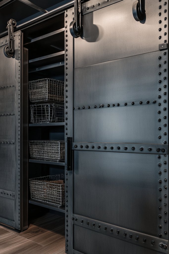 Add decorative rivets or bolts to accentuate the industrial look. Incorporate contrasting textures like wood or leather for a curated feel. Custom handles or pulls in vintage or matte finishes personalize the doors further. Lighting options like exposed filament bulbs nearby can enhance the raw aesthetic.