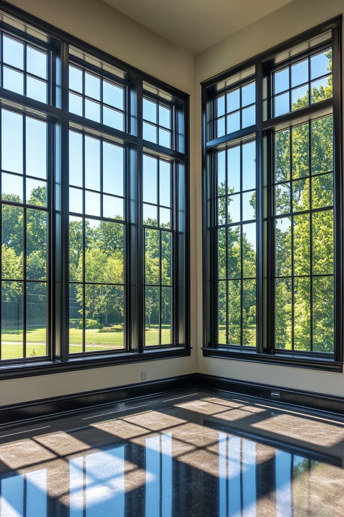 Imagine expansive floor-to-ceiling windows with slim black frames, revealing lush greenery outside. The natural sunlight streams in, highlighting the textures of wood beams and stone accents inside. Black frames create a striking contrast against warm wall colors and textured surfaces. The view outside becomes part of your decor, blurring the line between inside and out.
