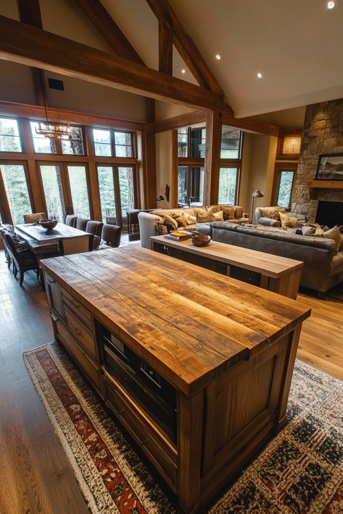 Imagine a large, flowing area with a reclaimed wood kitchen island serving as a focal point. The living area features a cozy sectional sofa and a large dining table, all in warm, natural tones. Open shelves and minimalist decor keep the space feeling airy. Sunlight streams through expansive windows, highlighting the rustic textures and creating a welcoming environment.