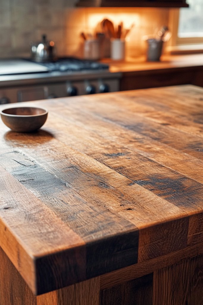 Picture a dining table made from a single live-edge slab of reclaimed wood, its natural contours and knots visible. The warm tones and textured surface invite touch and add warmth to the room. The kitchen counters, in similar wood, develop a patina over time, telling a story of use and care. Natural imperfections become the features that make the wood special.