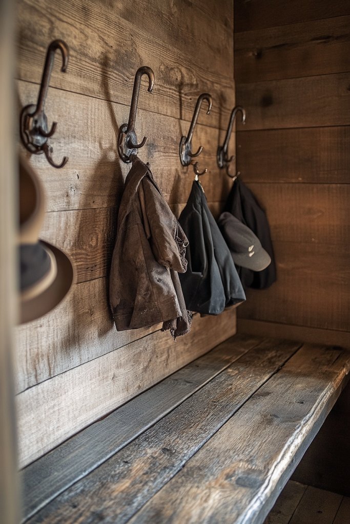 Visualize a narrow mudroom featuring a weathered wood bench with storage underneath and metal hooks above. The textured wood adds warmth, while industrial hooks provide a sturdy place for coats, hats, and bags. Baskets or bins underneath keep shoes tidy, and the overall look is both rugged and inviting. Natural light filters through, enhancing the rustic textures.