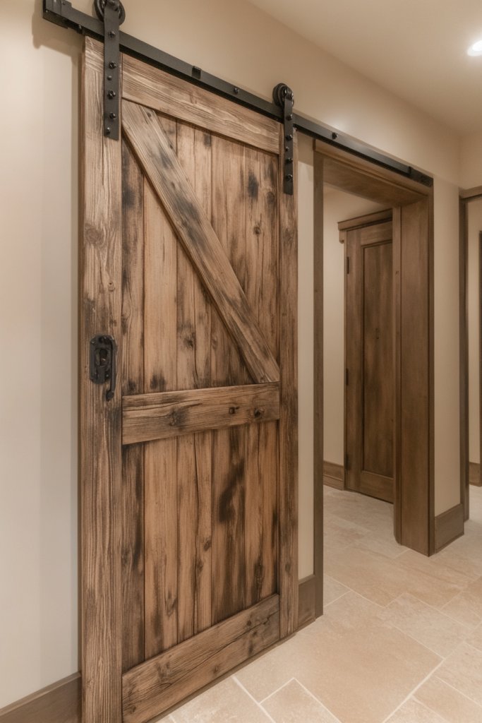 Picture a large sliding barn door made from reclaimed wood, its weathered surface adding character. The hardware is black iron, with rustic rollers that glide smoothly along a metal track. When closed, it creates a striking focal point; when open, it reveals a spacious, connected room. The textured wood contrasts beautifully with smooth walls, emphasizing the rustic-industrial look.