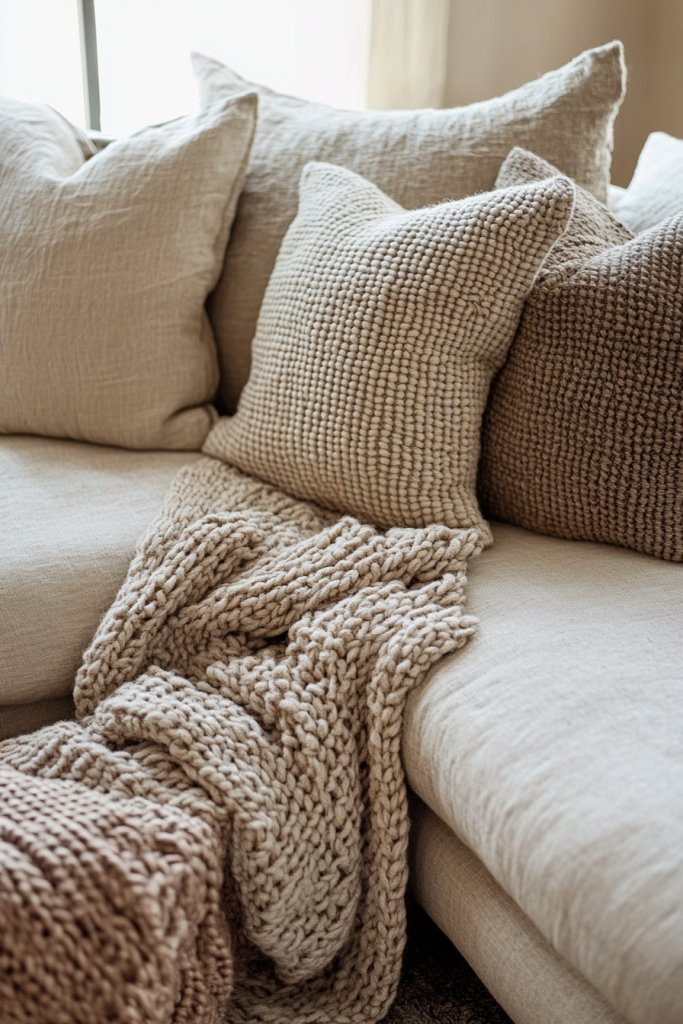 Visualize a living room with soft taupe walls, accented by a chunky knit throw in warm beige and textured burlap cushions. Natural fiber rugs and woven baskets complement the neutral tones, adding tactile richness. Layers of textured fabrics, such as linen curtains or faux fur throws, make the space feel layered and cozy. The overall effect is calming, warm, and welcoming.