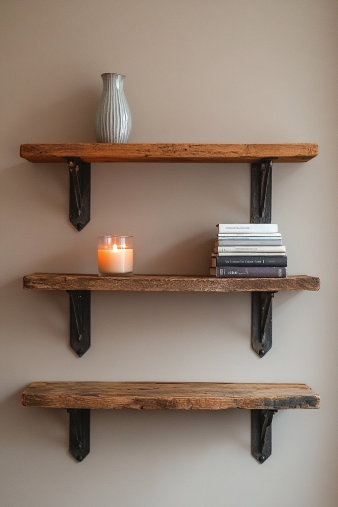 Select sturdy brackets made from iron or steel, and measure wall studs for secure anchoring. Cut or purchase reclaimed wood to your desired length, and sand surfaces for a smooth finish. Mount brackets securely into studs, then lay the wood supports on top. Use a level during installation to ensure straight lines. Finish with a sealant or stain to protect the wood and enhance its look. Arrange items thoughtfully to keep shelves functional and clutter-free.