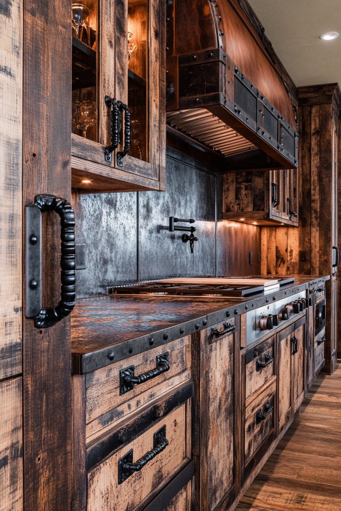 Imagine cabinets made from distressed wood with blackened or brushed metal hardware. The combination of rough-hewn surfaces and industrial accents creates a warm, inviting focal point. Open shelving with vintage metal brackets displays your favorite dishes or cookware, adding to the charm. The mix of textures and materials gives your kitchen a lived-in, welcoming vibe.