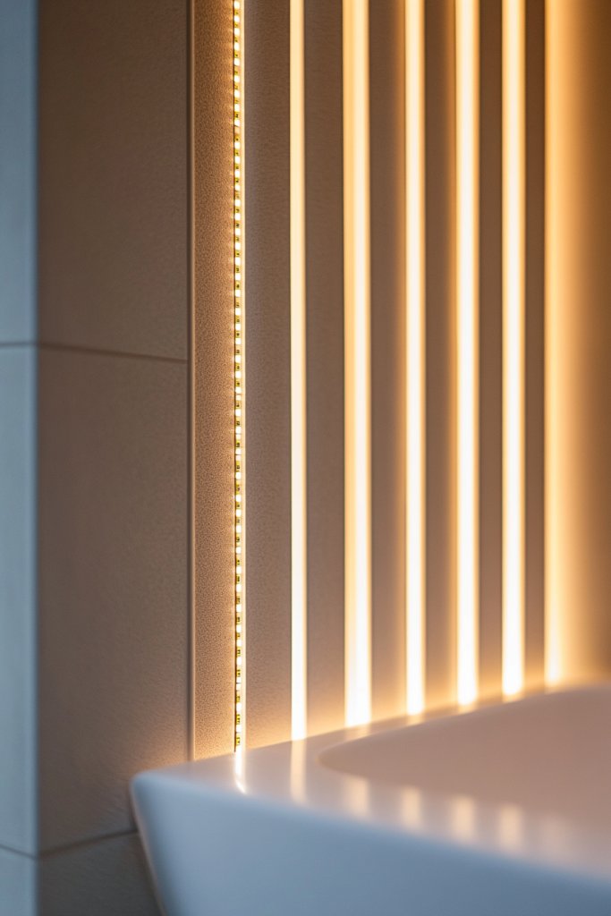 Picture a wall with vertical battens, with concealed LED strips running behind each one. The light gently diffuses through the gaps, casting a warm or cool glow depending on your preference. The subtle illumination highlights the wall’s texture and architecture, creating a layered, sophisticated look. Shadows and light interplay add depth, making the space feel more spacious and calming. It’s like your bathroom is softly glowing from within, inviting you to relax.