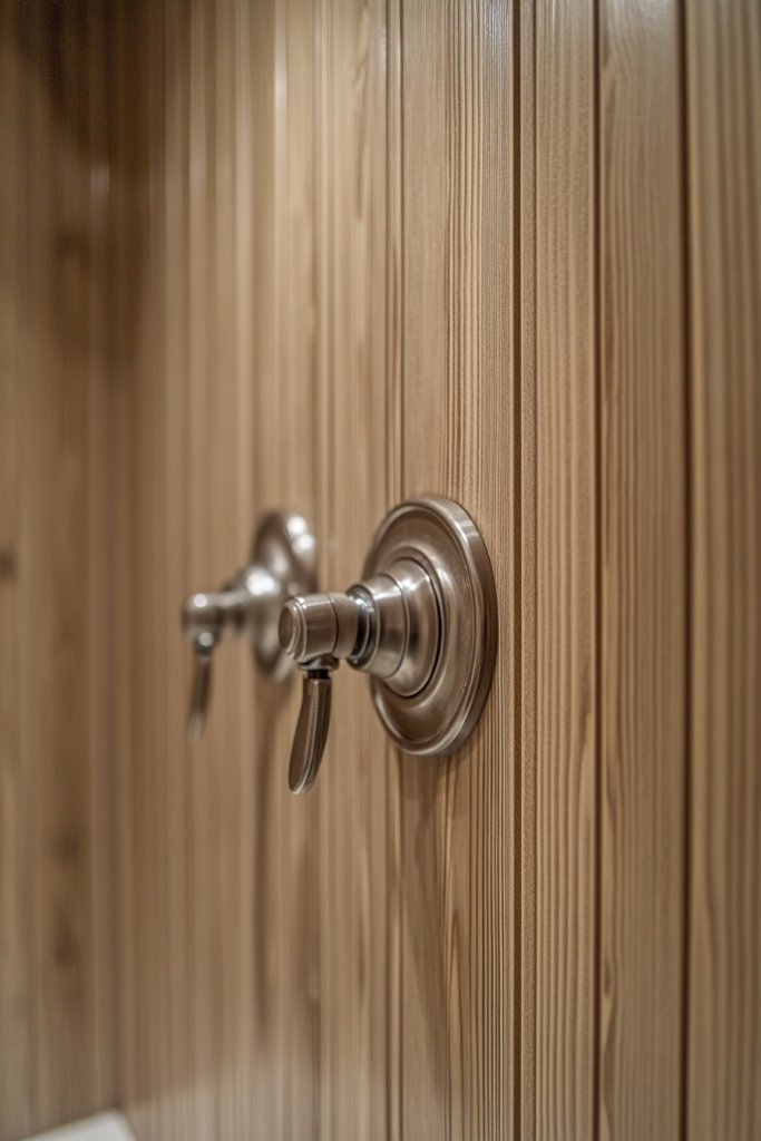Imagine vertical battens framing sections of textured paneling that mimic the look of vintage beadboard. The raised lines and subtle indentations add tactile interest, inviting touch and visual warmth. Soft, pastel paint hues or weathered finishes amplify the vintage appeal, making the space feel inviting and lived-in. The gentle ridges and grooves create shadows that soften the overall look, giving your bathroom a cozy, timeless ambiance. It’s like stepping into a charming seaside cottage.