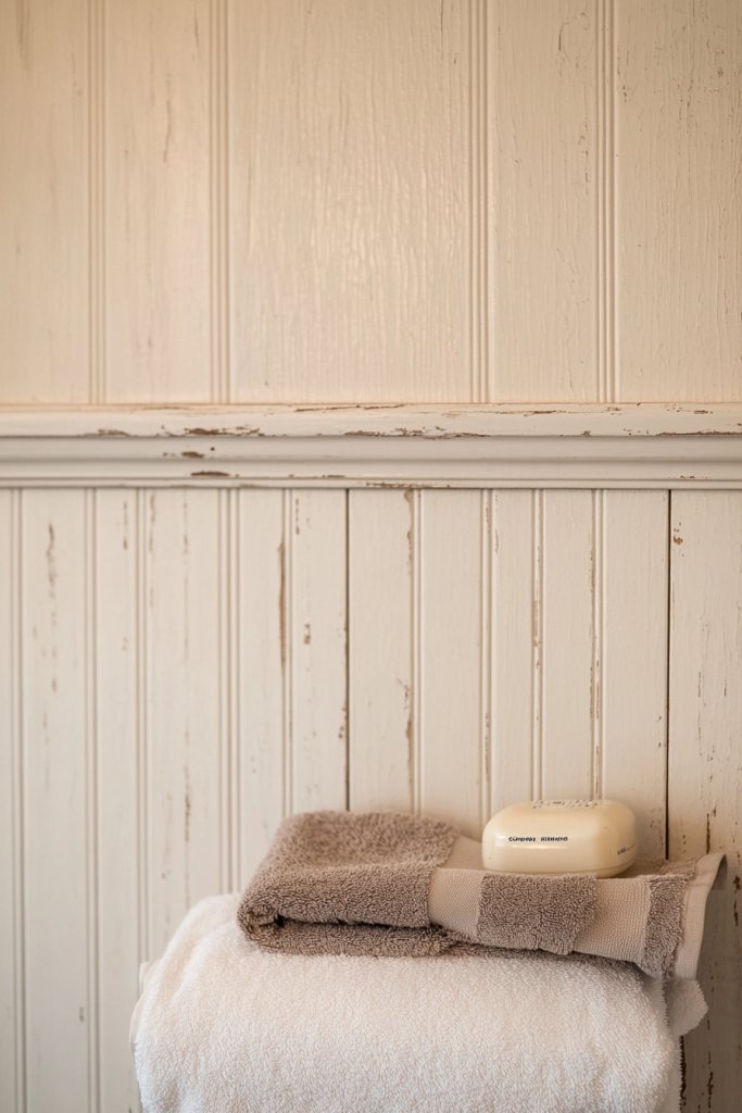 Accessorize with vintage-inspired hardware, ceramic knobs, or antique-style hooks. Incorporate decorative shelves or small wall-mounted cabinets painted in coordinating colors. Add textured or patterned fabrics in curtains or towels to complement the vintage charm. Consider layered lighting with wall sconces to highlight the textured panels and create a warm glow.