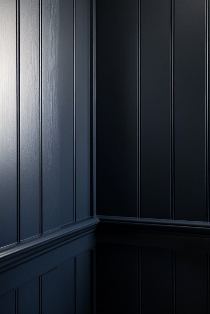 Envision walls painted in a rich navy or dark gray, with matte or satin finishes that absorb light beautifully. Vertical or horizontal battens painted in the same hue or a contrasting shade add subtle texture without breaking the mood. The deep tones create a cocooning effect, making the room feel intimate and refined. Accentuate with metallic fixtures, white towels, or light-colored accessories for sharp contrast. The overall effect is both bold and polished, like a tailored tuxedo.
