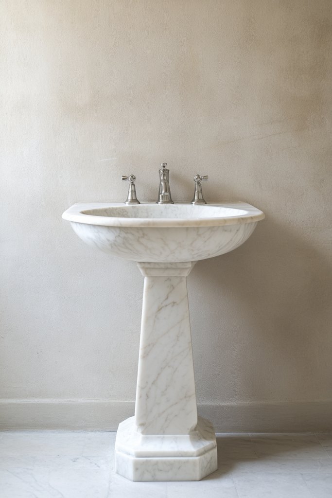 Choose from ornate, carved designs for a vintage look or sleek, simple shapes for contemporary appeal. Pair with wall-mounted mirrors and classic fixtures for a cohesive style. For small bathrooms, a slender pedestal minimizes visual bulk. You can also opt for a matching marble shelf or small storage niche nearby.
