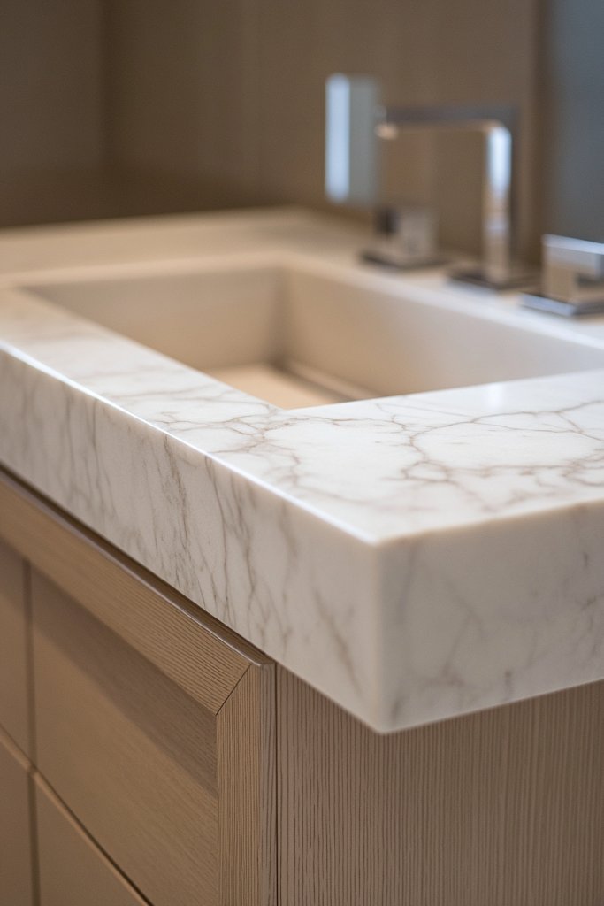 Imagine a sleek marble slab seamlessly inset into a custom-built cabinet with minimalist hardware. The veining on the marble contrasts beautifully with the cabinet’s finish—matte, gloss, or textured. The clean lines and smooth surface create a calming, high-end vibe. When you open the drawers or cabinets, the marble top remains the star.
