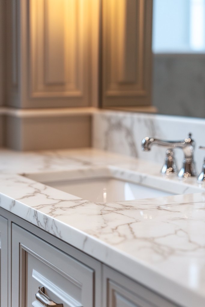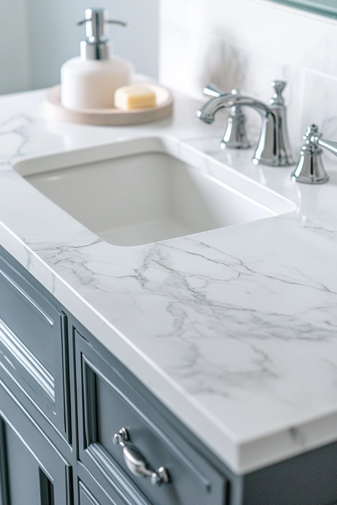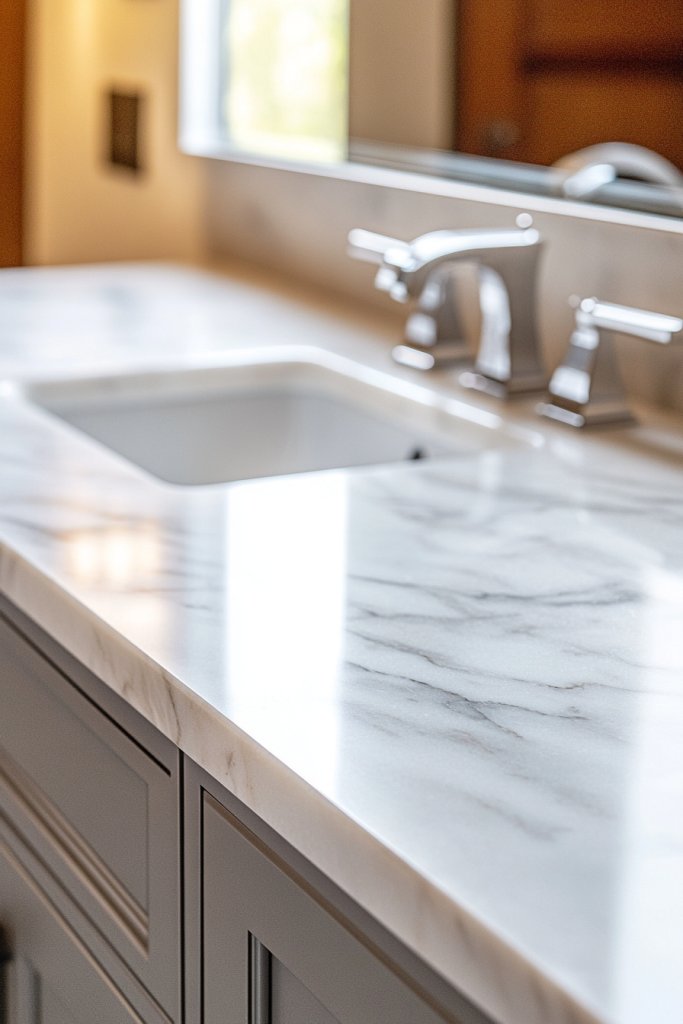Picture a sleek, polished marble surface in soft gray with subtle veining, perfectly framing your under-mount sink. The smooth, reflective surface adds a touch of luxury, making the entire bathroom feel more refined. When you open the cabinet beneath, the contrast of the marble against your fixtures creates a striking aesthetic. Soft lighting makes the marble shimmer, creating an inviting atmosphere.