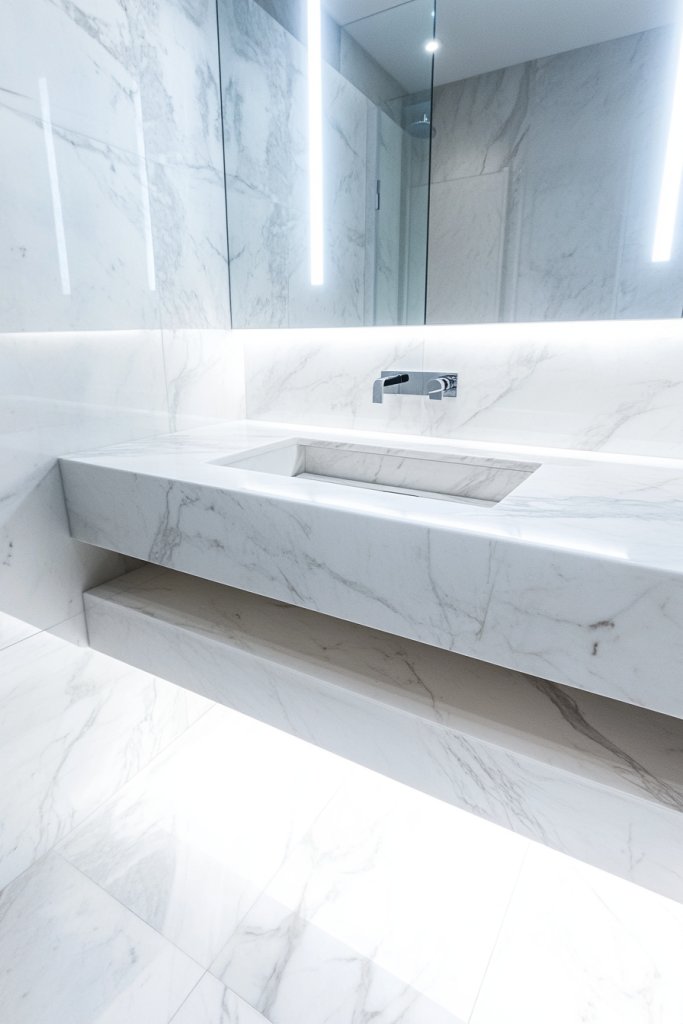 Imagine a wide marble slab mounted flush against the wall, with no visible legs or supports. The marble’s veining flows seamlessly across the surface, catching ambient light and adding depth. The open space beneath creates a floating illusion, making the room feel more spacious and less cluttered. Soft lighting underneath enhances the floating effect.