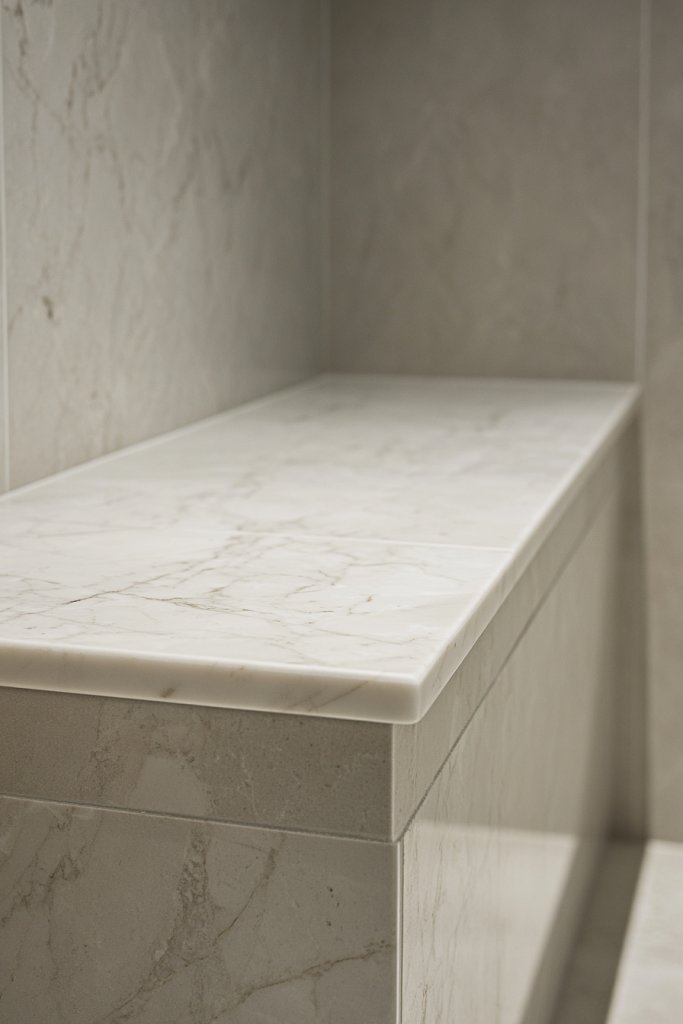 Visualize a sleek marble bench nestled into the corner of your shower, with veins that match or contrast with the surrounding tiles. The polished surface gleams under soft lighting, inviting you to sit and relax. The natural patterns add depth and texture, making the shower feel like a high-end resort. It’s both functional and aesthetic.