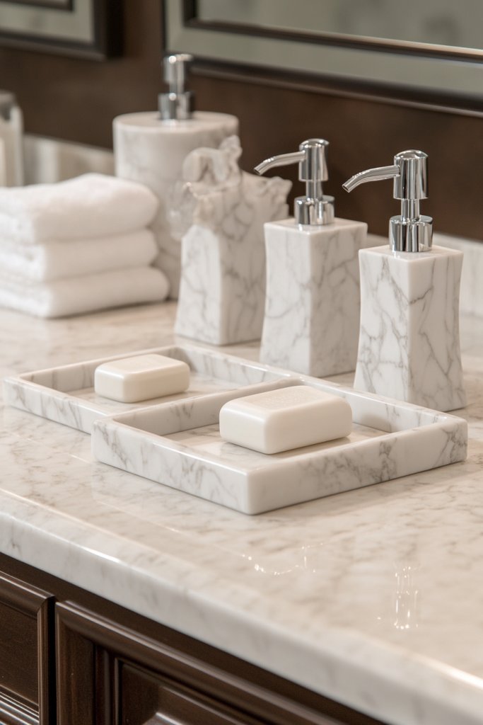 Add small decorative elements like marble bases for candles or small sculptures. Coordinate with other marble accents in your space—vanity tops, shelves, or trims—for a unified look. Use lighting to highlight architectural details and the veining’s natural beauty. Keep clutter minimal to let the fixtures stand out.