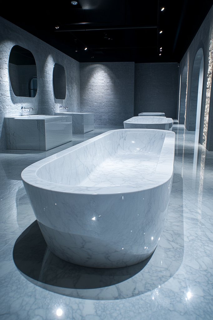 Envision a sleek, oval marble tub perched elegantly in the corner of your bathroom. The cool, polished surface catches ambient light, making the space feel cooler and more refined. Its sculptural curves invite you to relax and unwind, transforming your daily bath into a spa-like experience. Surrounded by soft textiles and ambient lighting, it’s pure luxury.