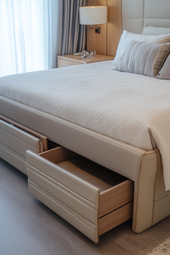 Imagine sleek pull-out drawers gliding smoothly beneath your bed frame, neatly organized with labels. You see a tidy space where soft fabrics like cotton sheets or fluffy slippers are stored without creating visual chaos.