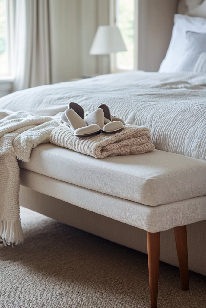 Cluttered bedrooms often feel cramped and chaotic, especially when extra bedding or shoes are strewn about. A storage bench at the foot of your bed offers a dual purpose—providing extra seating and hidden storage.