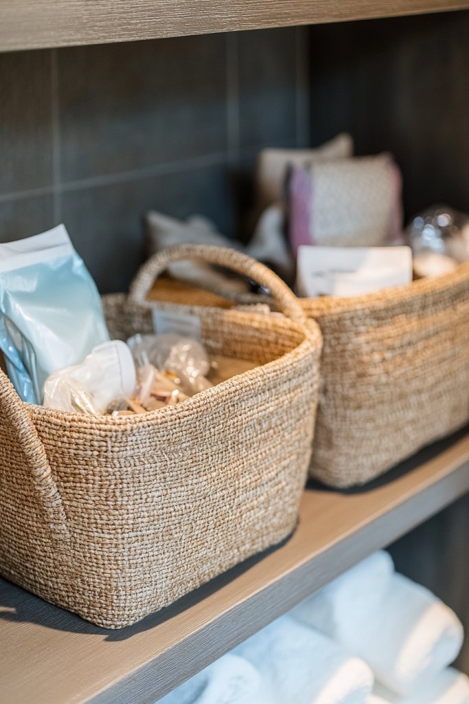 Mix and match basket styles to add visual interest. Use scented sachets inside for freshness, especially if storing linens.