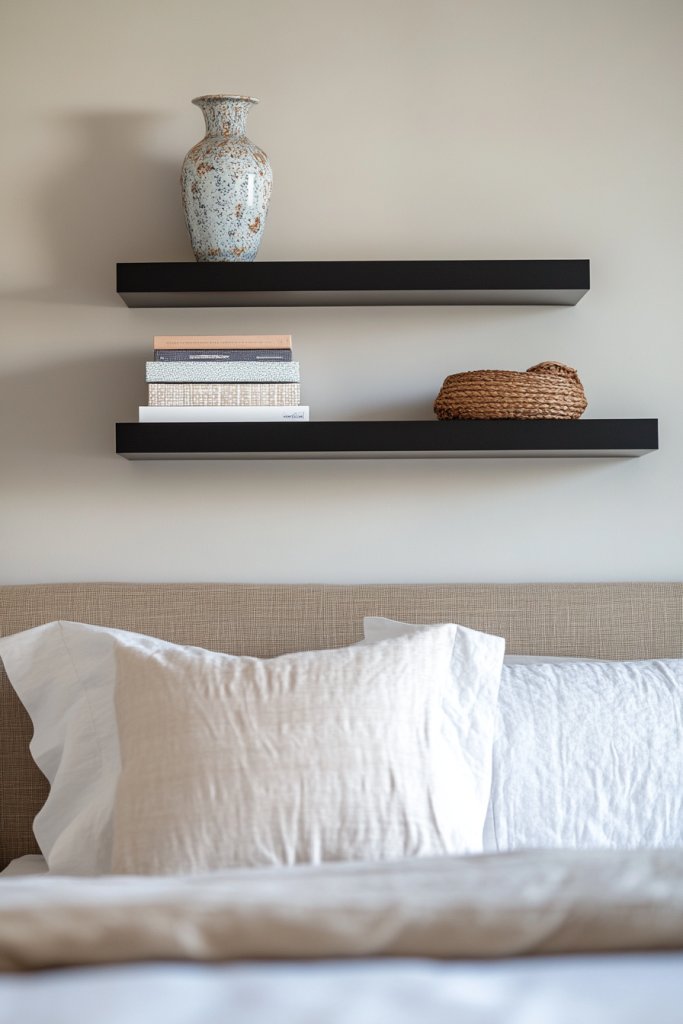 Picture narrow, minimalist shelves mounted high on your bedroom wall, holding a row of neatly stacked books, decorative storage baskets, or small accessories. The shelves appear to float effortlessly, thanks to hidden brackets, creating a clean, modern look.