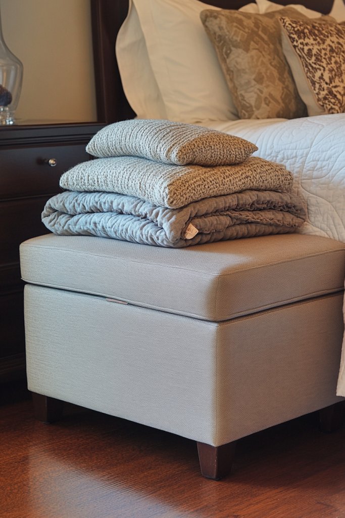 Want to add a cozy yet organized touch? This is your answer. Picture a plush, upholstered ottoman placed at the foot of your bed, its fabric inviting and soft to the touch.