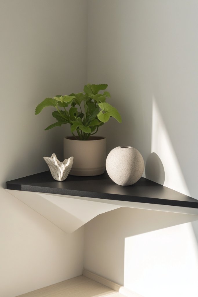 Layering items—like stacking books horizontally with a small ceramic dish—adds depth. Transform plain walls into eye-catching storage zones that reflect your personality.