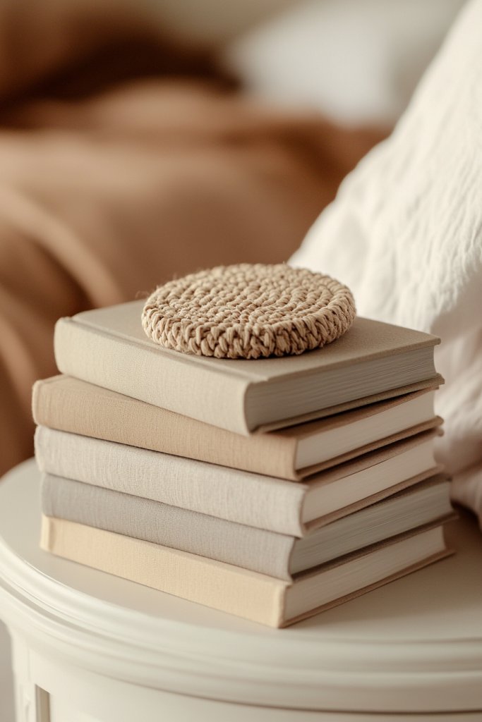 Start by selecting a handful of your favorite books that complement your bedroom palette. Choose soft textured coasters made from materials like velvet, knitted fabric, or silicone for variety.