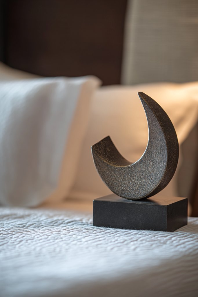 Its rounded shape and smooth surface add a touch of modern elegance, contrasting beautifully with textured bedding or linens. Soft shadows dance on the walls, making the space feel cozy and inviting.