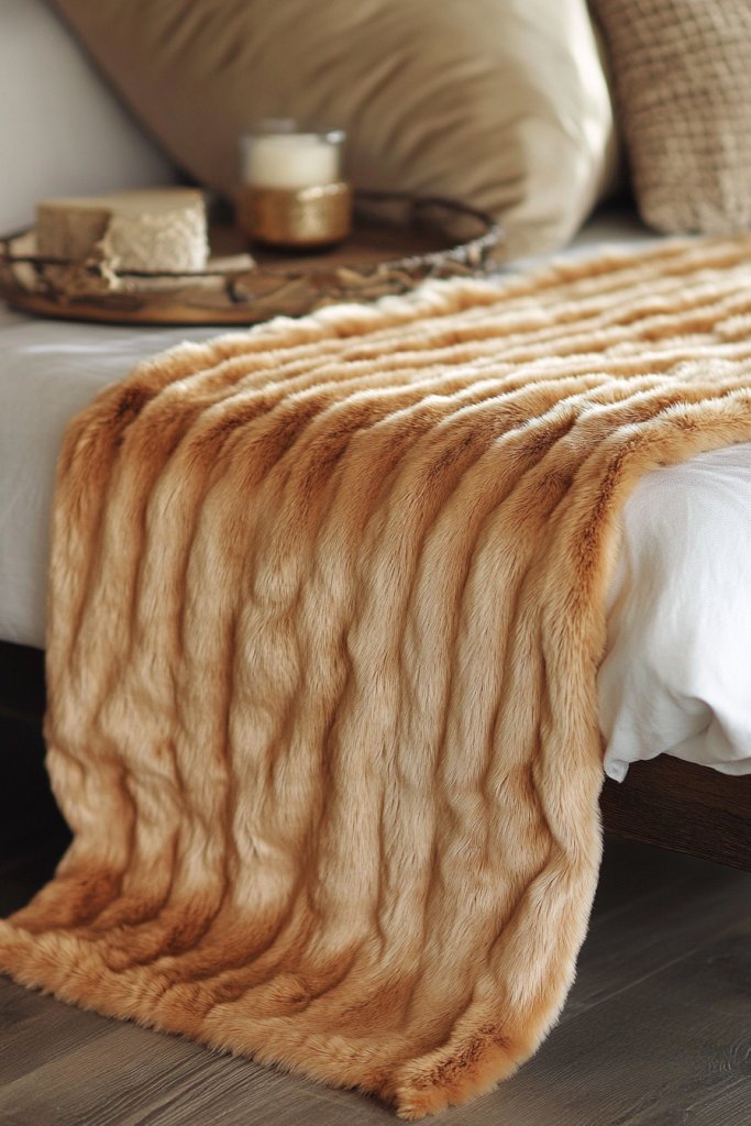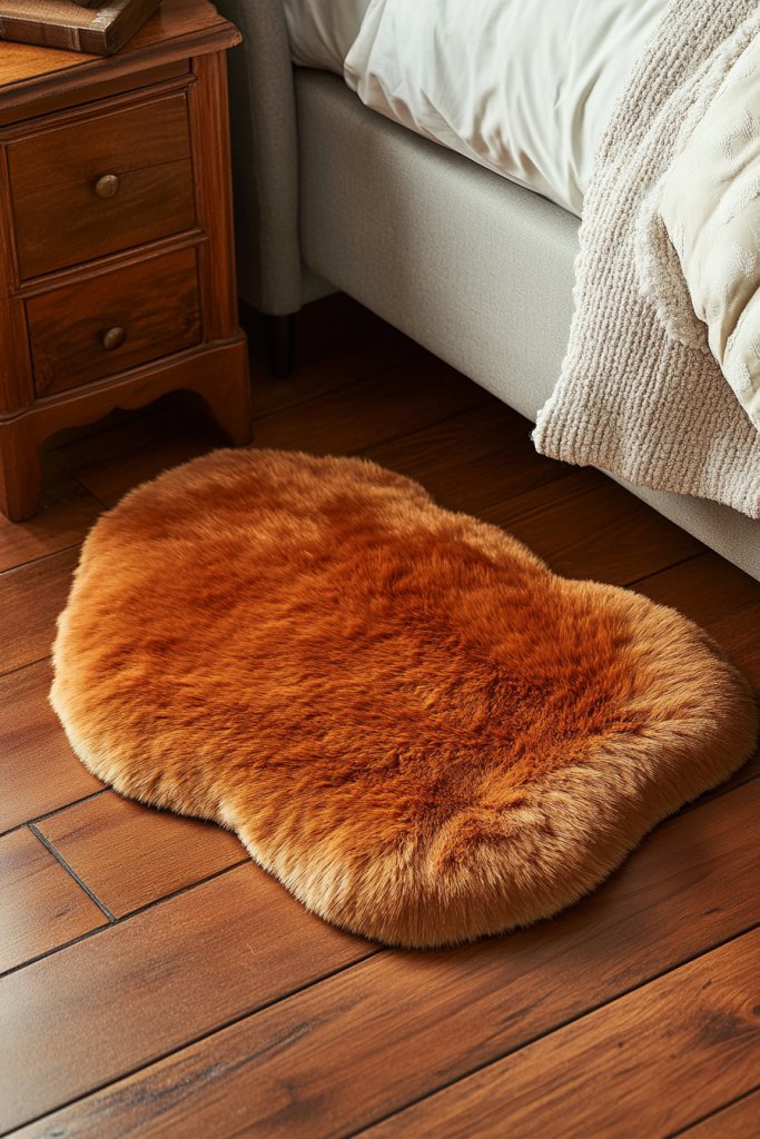 But how do you add tactile comfort without clutter? Visualize a plush faux fur rug in a creamy white or soft gray draped partially over your bedside area. Its fluffy texture invites your feet to sink in, immediately adding warmth and softness.