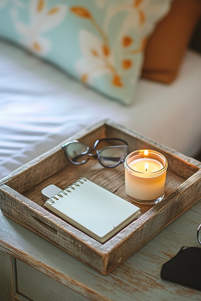 Select a wooden tray that fits the size of your bedside surface and matches your aesthetic. Arrange your most-used items—like a clock, skincare, or a favorite book—in a way that feels organized but not overcrowded.