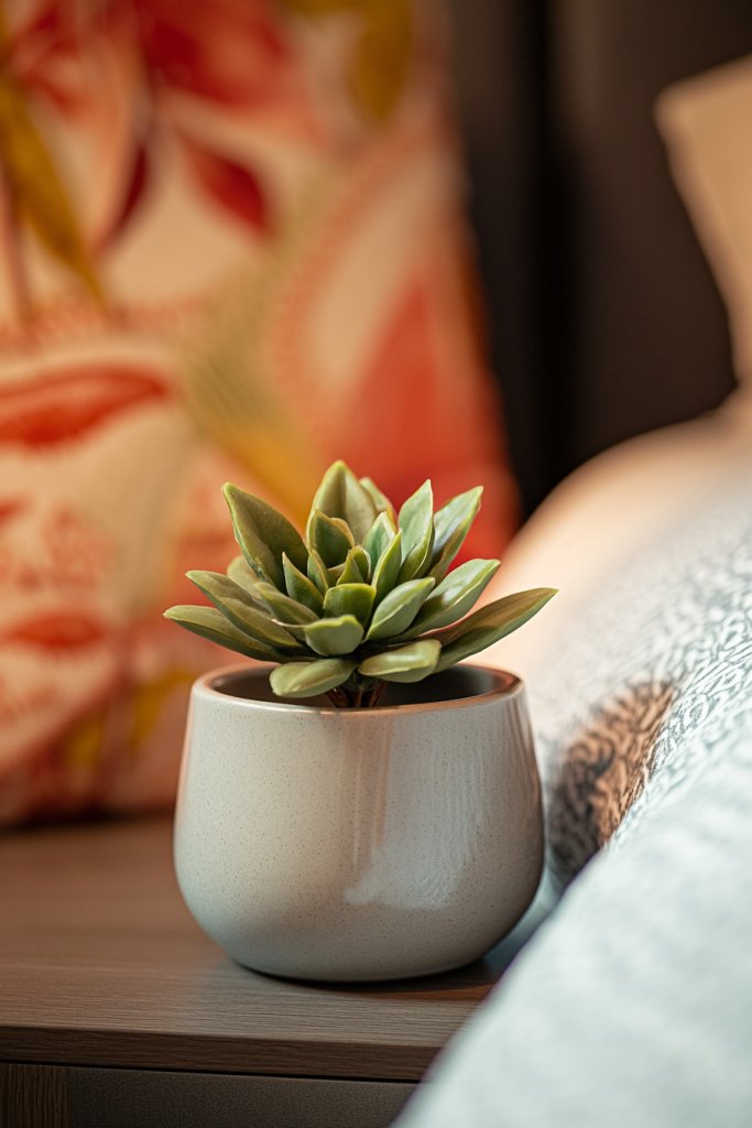 But how do you make faux greenery look authentic and stylish? Imagine a small, realistic faux succulent in a textured ceramic pot sitting on your bedside table. Its vibrant green leaves contrast beautifully with neutral bedding and textured pillows.