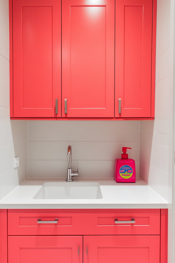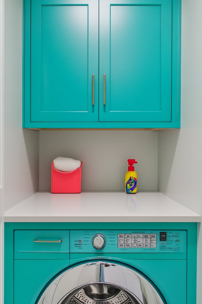 Create visual interest with textured wall decals or a decorative stripe painted in a contrasting shade. Add functional accessories like a colorful laundry basket or a set of hanging hooks painted in a matching hue. Incorporate a small shelf for storage or display, painted in a neutral tone to balance the bright cabinetry.