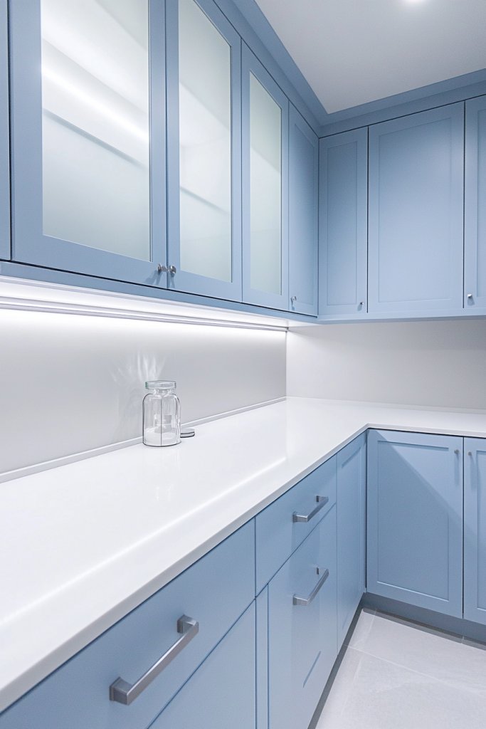 Picture soft blue cabinets with a matte finish that reflect a dull glow, creating a tranquil atmosphere. Light-colored textiles, like a woven basket or a linen cloth, complement the gentle hue. Add in a splash of white or cream to brighten the scene further, making every task feel a bit more relaxed and less like a chore.
