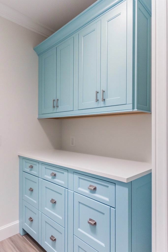 Picture aqua cabinets with a semi-gloss sheen that reflect light and amplify the cheerful vibe. Pair with white or neutral walls to prevent overwhelming the space. Textured textiles, like a patterned rug or a woven hamper, add tactile contrast and keep the room feeling cozy. Small accents like colorful hooks or labels complete the playful look.