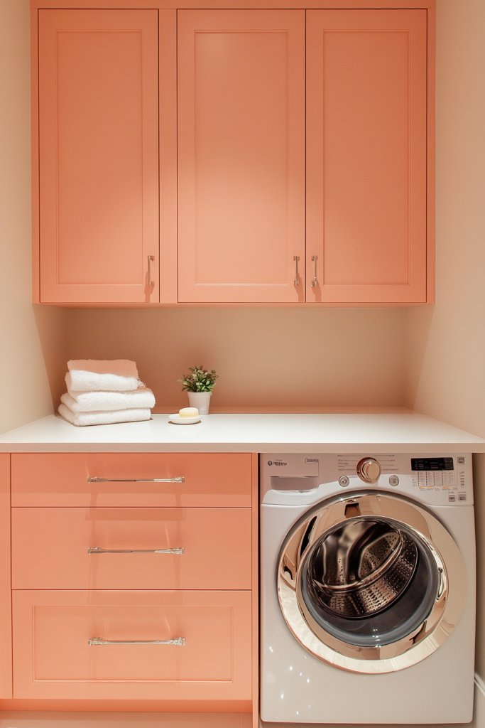 Coral and peach hues bring warmth and vitality to small laundry rooms, making chores feel less like drudgery. They create a friendly, welcoming environment that lifts your mood. With a little paint and some thoughtful details, your space will radiate personality and charm.