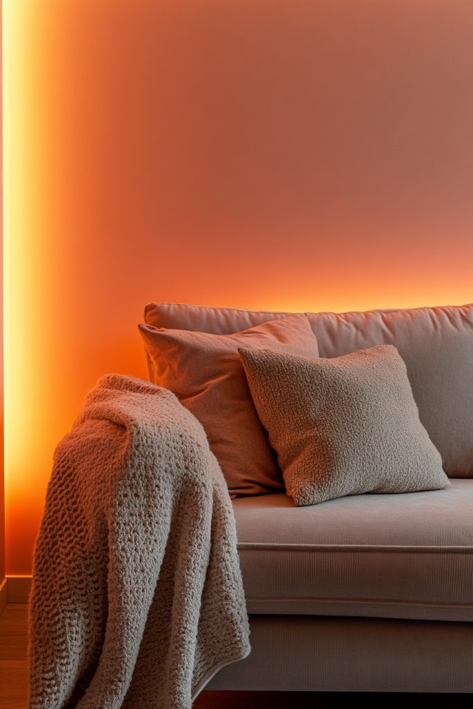 Picture a living room bathed in a delicate, warm blush hue reminiscent of rose quartz. Plush textiles like a cream velvet sofa and a textured throw blanket add layers of softness. The subtle sheen of metallic accents in the decor catches the light, enhancing the glow. Natural light filters through sheer curtains, casting a gentle warmth across the space. Soft, inviting cushions and a cozy area rug complete this calming scene, making it feel like a retreat.