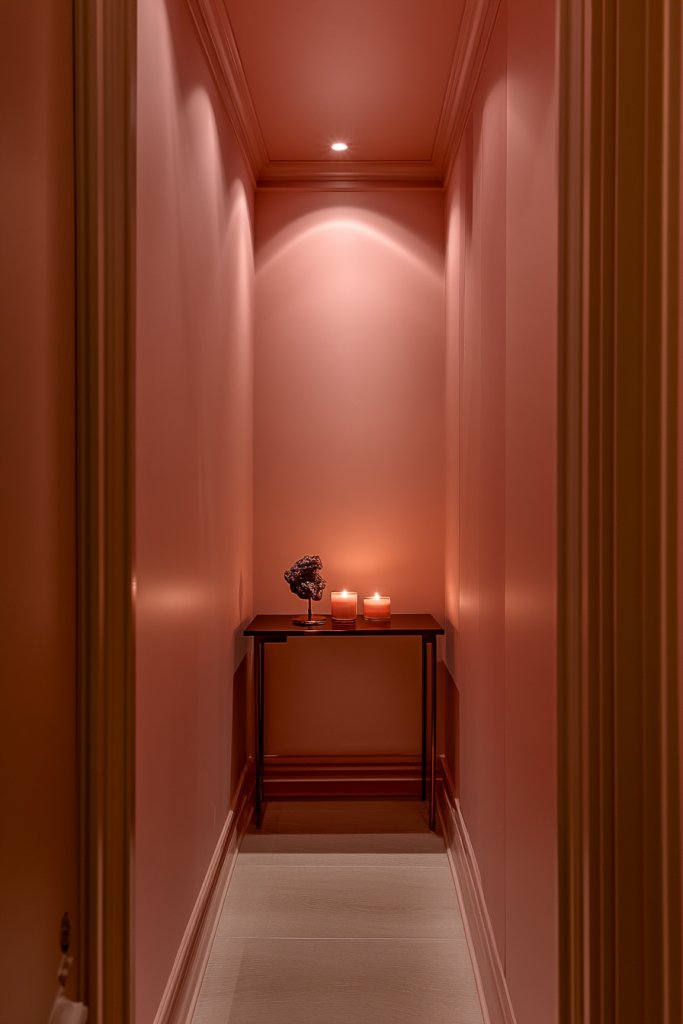 Visualize a narrow hallway painted in warm blush with a gentle sheen from satin finish. Soft lighting highlights the color’s richness, making the space feel inviting. Minimalist wall decor, like a sleek mirror or a few framed photos, adds personality without clutter. A runner in a coordinating hue or textured material creates visual interest and comfort underfoot. The overall effect is a welcoming, elegant transition between rooms.