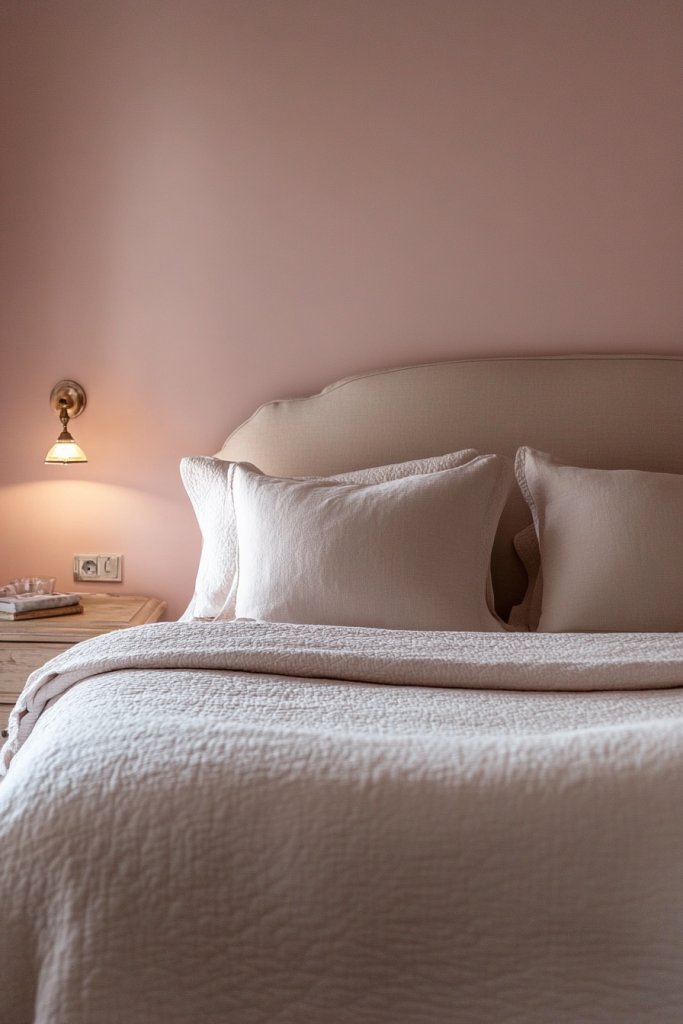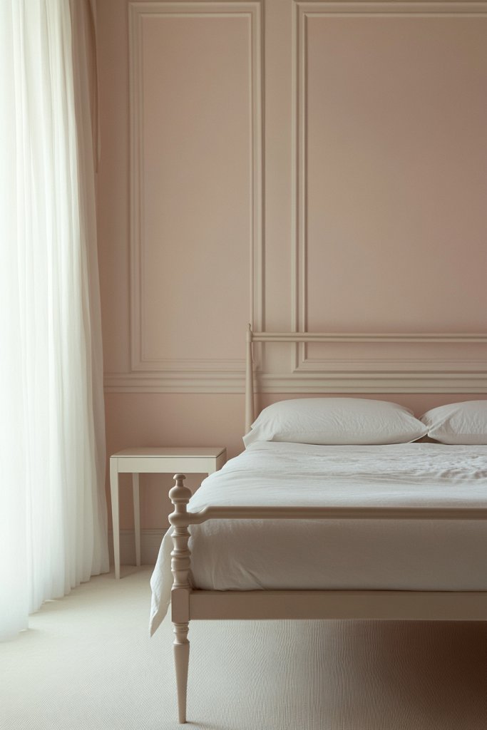 Imagine a bedroom with soft, muted blush walls that serve as a gentle canvas. Crisp white bedding and light wood furniture keep the look airy and fresh. Subtle accents like a plush linen throw or a cozy rug add texture without cluttering the space. Natural light pours in through sheer curtains, illuminating the soft tones and making the room glow gently. Small decorative touches like a delicate ceramic lamp or a simple mirror enhance the peaceful vibe.