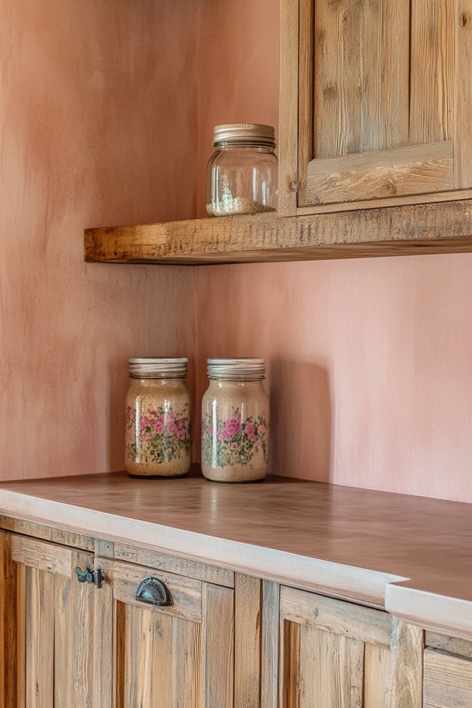 Imagine a kitchen with blush hued cabinets paired with distressed wood countertops. Vintage-inspired hardware and open shelving display ceramic dishes and aged jars. A farmhouse sink, soft textiles, and a woven rug add layers of texture. The walls, painted in a gentle blush, reflect natural light, making the space glow warmly. Small decorative touches like a rustic clock or a basket of fresh produce complete the cozy scene.