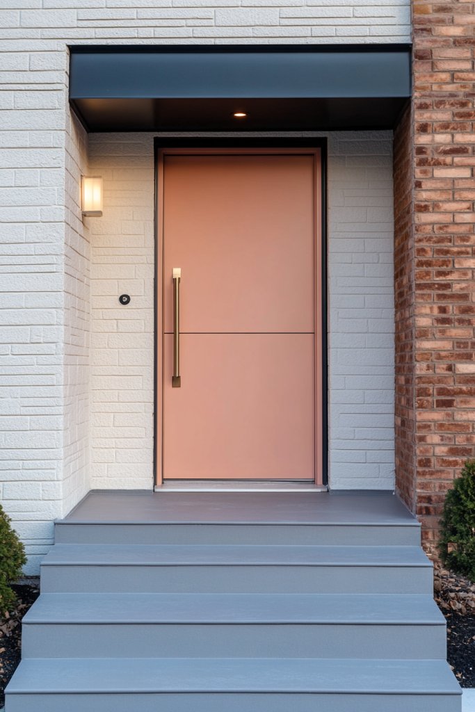 Imagine a front door painted in a rich, warm blush that stands out against neutral siding. Add contrasting hardware in black or brass for a sophisticated look. Surround the door with simple, clean landscaping or decorative trim. A welcoming doormat and a few potted plants complete the scene, but the door remains the focal point. The result is eye-catching, inviting, and full of personality.