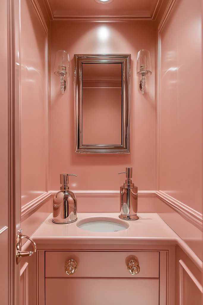 Picture a powder room painted in blush pink with a satin or matte finish that radiates subtle elegance. Gold or brass fixtures—like a faucet, towel ring, or mirror frame—add a luxurious touch. A small vessel sink, decorative soap dispenser, and plush hand towel complete the look. Soft lighting enhances the shimmer of metallic accents, creating a cozy yet glamorous atmosphere. The space feels refined, inviting, and full of character.