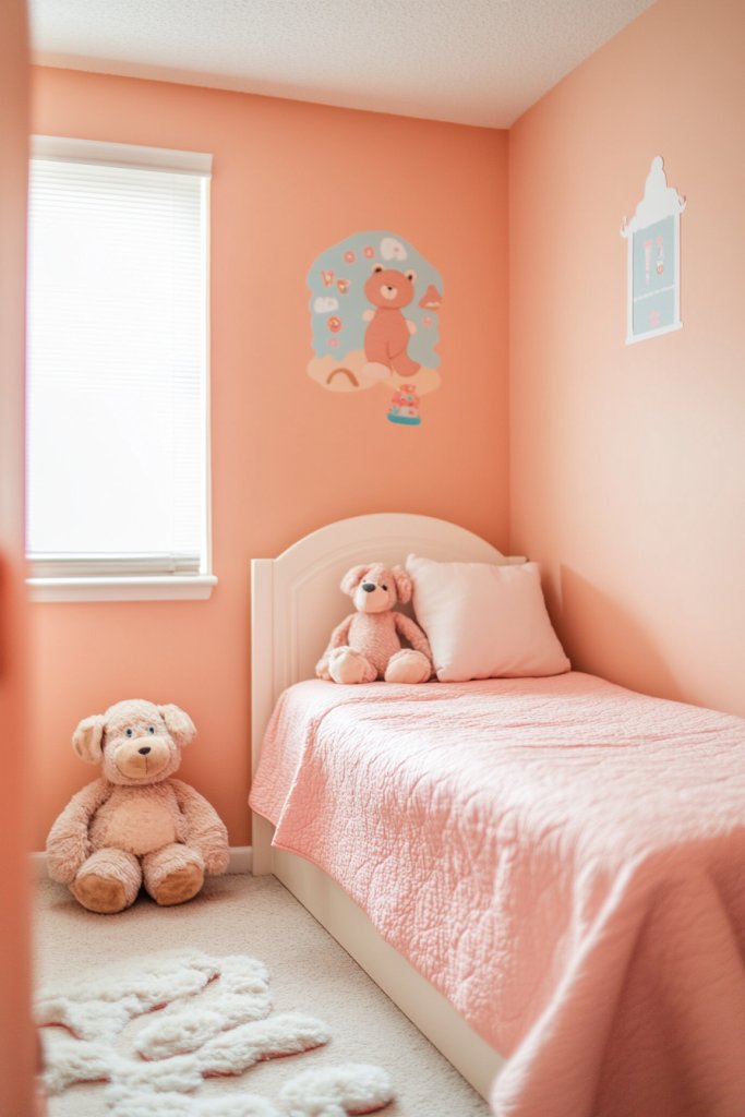 Imagine walls painted in a warm, peachy blush that radiates warmth and cheer. Bright, colorful bedding and playful wall decals add personality. Textured rugs and soft curtains in coordinating shades soften the space. Decorations like a hanging hammock chair or a funky lamp create a fun, inviting environment. The room feels lively, cozy, and perfect for playtime and winding down.