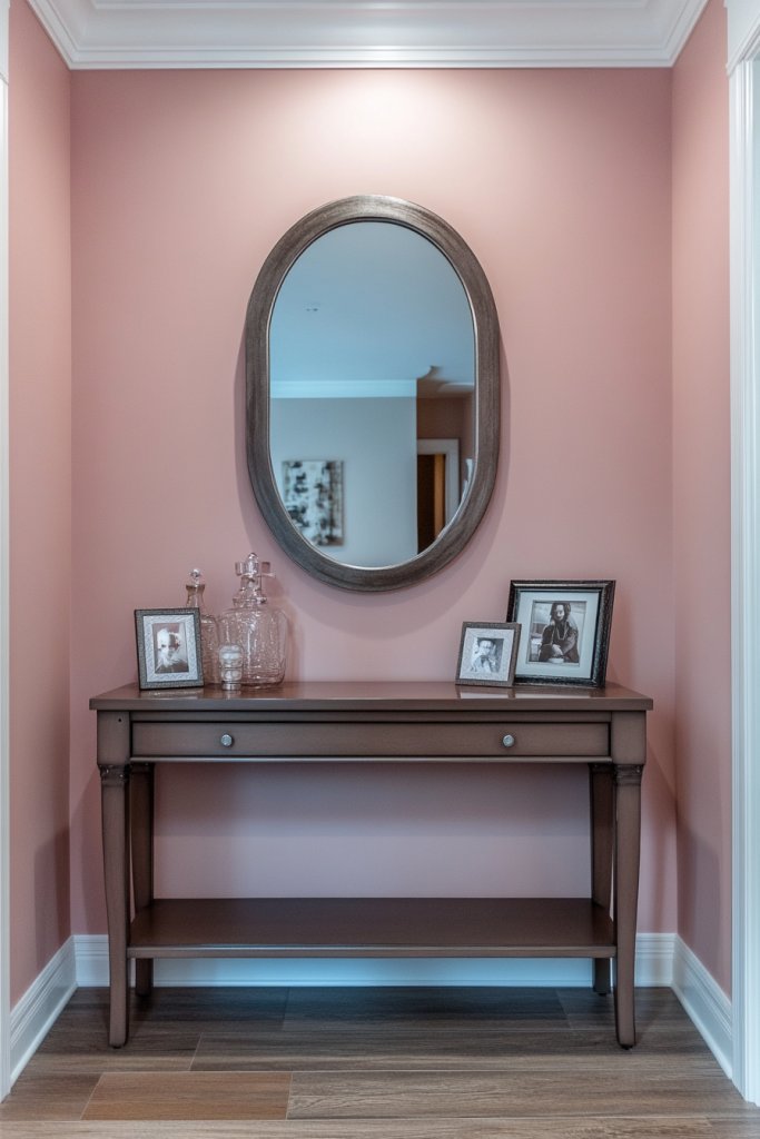 Imagine a cozy entry with soft blush walls that have a hint of gray, giving a chic, muted effect. A textured rug in neutral tones welcomes visitors, while a sleek console table holds a decorative tray or a sculptural piece. Light fixtures in matte black or brushed nickel add modern contrast. A mirror with a decorative frame reflects the soft hues and brightens the space. The overall look is inviting, stylish, and effortlessly sophisticated.