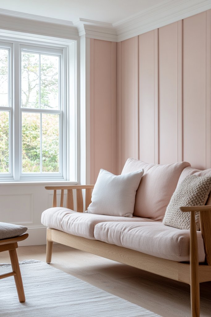 Visualize a living room with blush pink walls paired with light wood furniture and simple, functional accessories. A cozy knit throw in a muted tone drapes over a sleek sofa. Light filters through sheer curtains, casting a soft glow. Minimalist shelves display a few carefully curated decor items, avoiding clutter. The overall scene feels calm, inviting, and effortlessly stylish—perfectly Scandinavian.