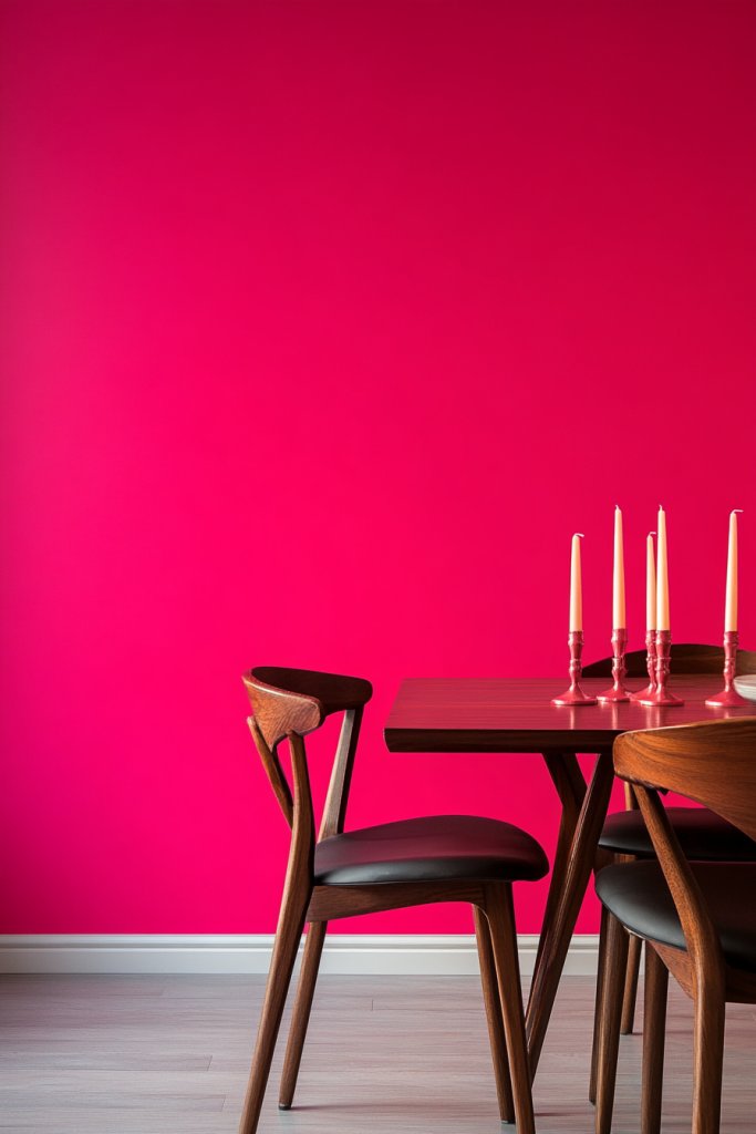 Picture a dining room where one wall is painted in a lively blush tone, contrasting beautifully with white or neutral furniture. A sleek wooden table and minimalist chairs keep focus on the wall’s vibrant hue. Pendant lighting or a chandelier in a metallic finish adds a touch of glamour. Decorative elements like a textured rug and a set of modern art pieces complete the scene. The space feels energetic yet elegant, perfect for entertaining.