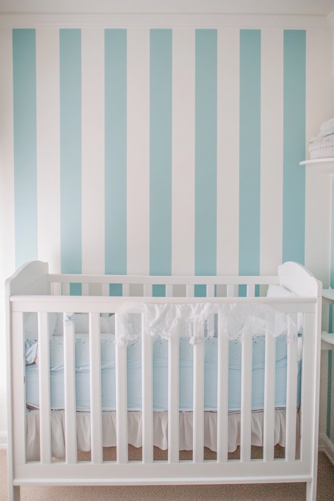 Add decorative decals or hand-painted motifs inside the stripes for extra fun. Coordinate textiles—bedding or curtains—with one of the stripe shades. Personalize with a name or quote painted on the wall below the stripes for a custom touch. These details make the nursery lively and unique.