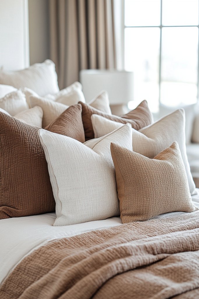 Imagine soft, creamy sheets topped with a chunky knit throw in shades of beige and taupe. Fluffy pillows in varying textures, from woven to velvet, add depth and tactile interest. The layered bedding creates a lush, inviting bed that beckons you to relax. Warm ambient light reflects off the textiles, enhancing the soothing vibe. It’s the kind of scene that makes you want to sink right in.