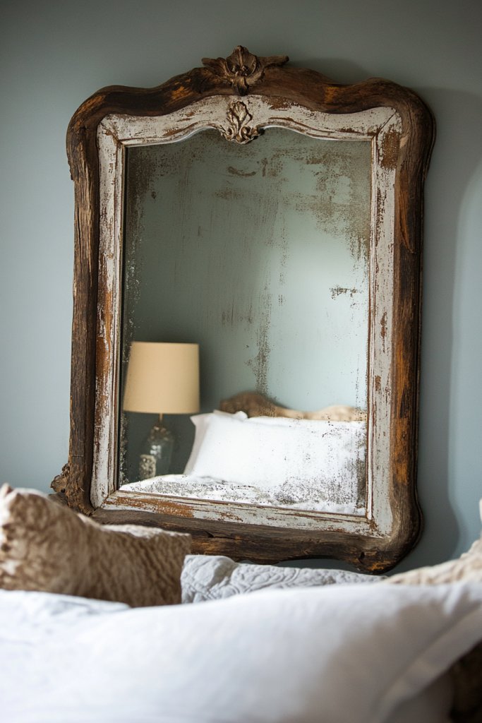 Want to make your bedroom feel bigger and brighter without major renovations? Decorative mirrors with natural or worn frames do the trick. They reflect light and add a touch of rustic charm, making your space feel more open and inviting. Plus, they’re a stylish way to add personality.