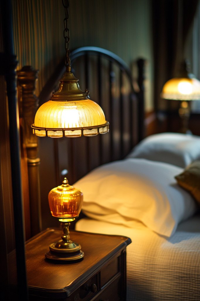 Picture a vintage brass pendant casting a gentle amber light over a textured bedspread. Nearby, a distressed metal wall sconce with exposed bulbs provides a subtle glow, emphasizing the room’s rustic charm. The warm light highlights the earthy tones and textured fabrics, making everything feel cozy and lived-in. The overall effect is nostalgic and welcoming, like stepping into a charming cottage.